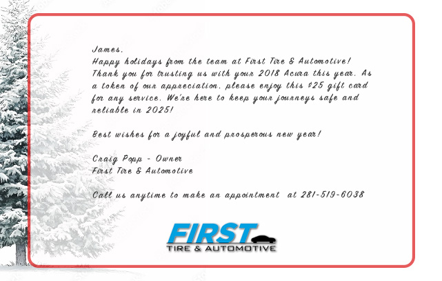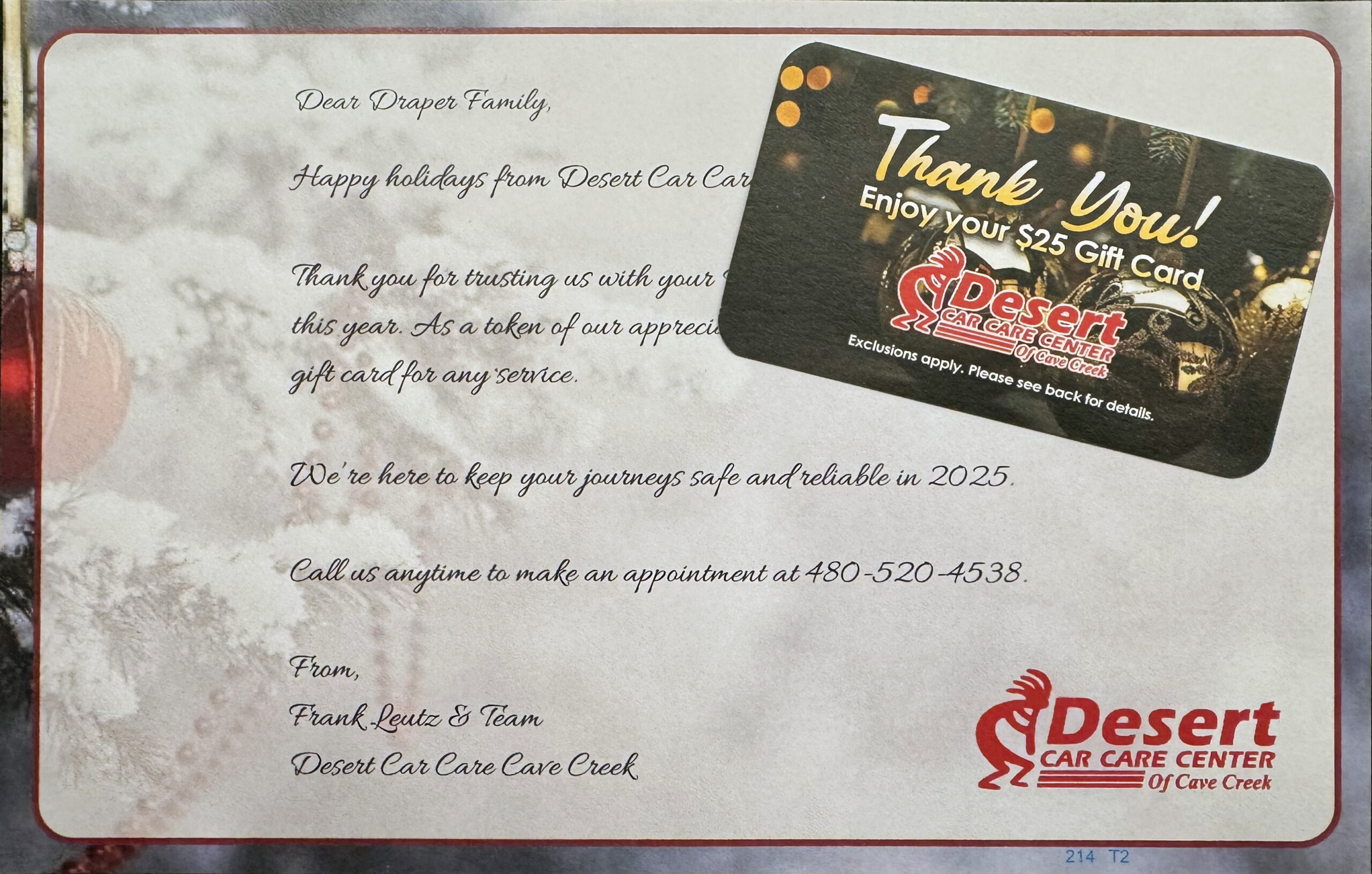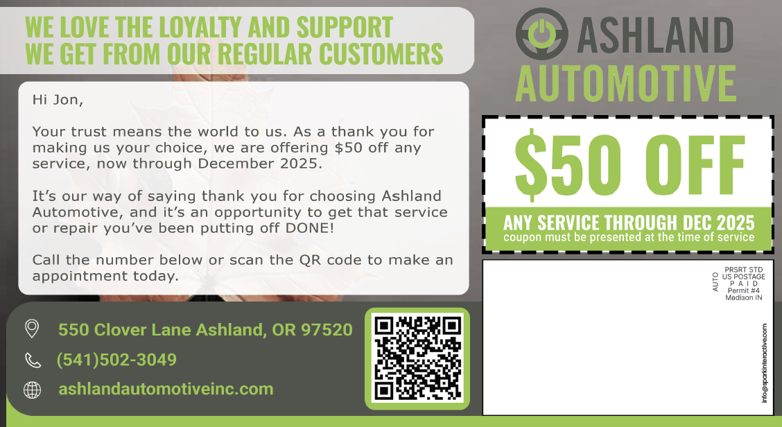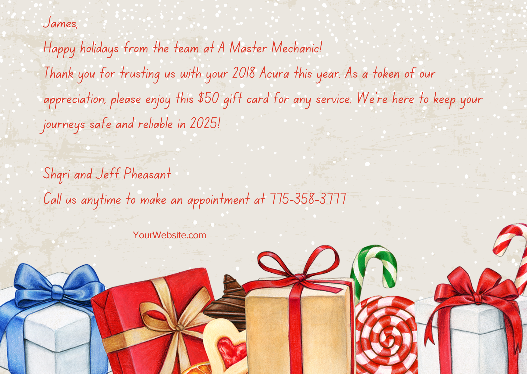 Many shops choose to include a shop credit (like “$25 toward your next visit — good for any service”) or an Oil Change Club Card (buy four, get one free). Both options encourage repeat business and keep customers returning long after the holidays.